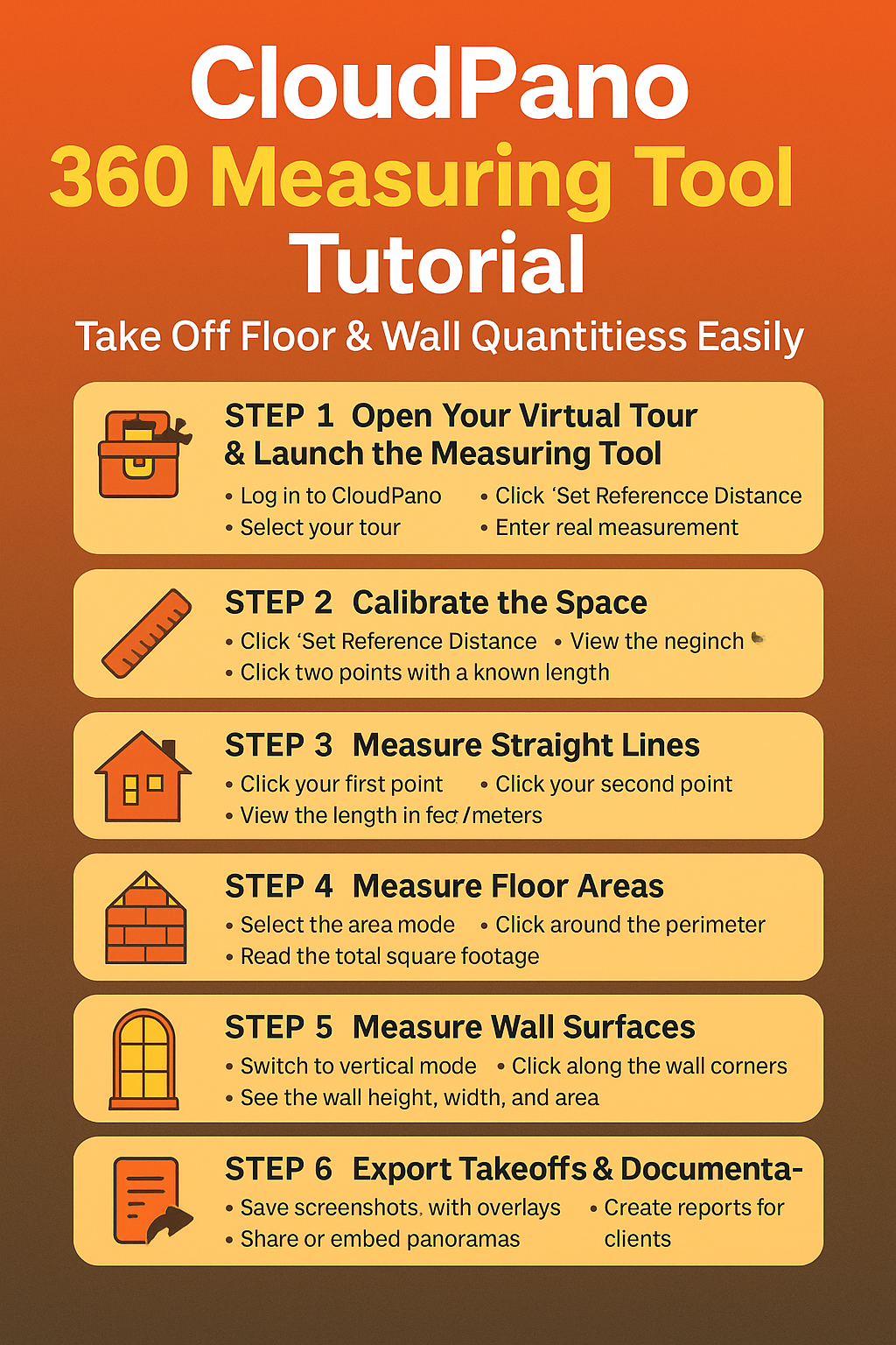 In this step-by-step tutorial, you’ll learn exactly how to use CloudPano’s 360 Measuring Tool to take off floor areas, wall surfaces, and interior quantities quickly and confidently.