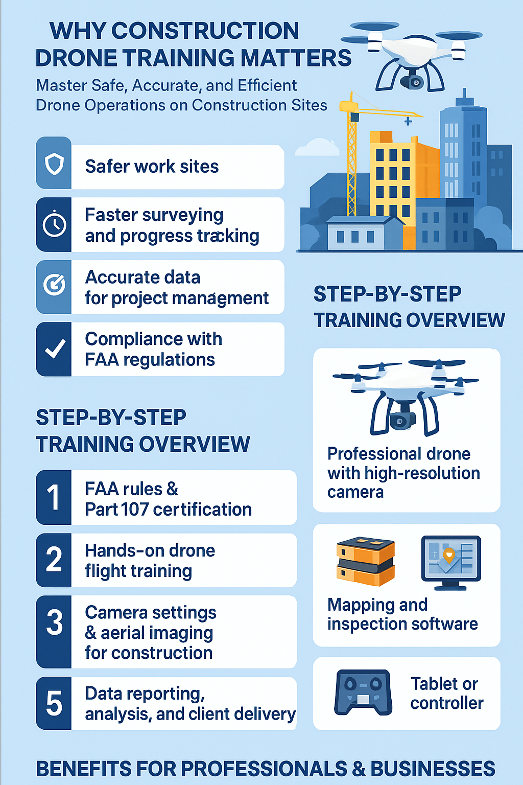 The construction world is changing fast—and drones are leading the transformation. Today, builders, engineers, and developers rely on drone technology for aerial construction surveys, progress reports, structural inspections, and real-time monitoring. As demand explodes, trained pilots with certified drone training are becoming some of the most in-demand professionals in the field.