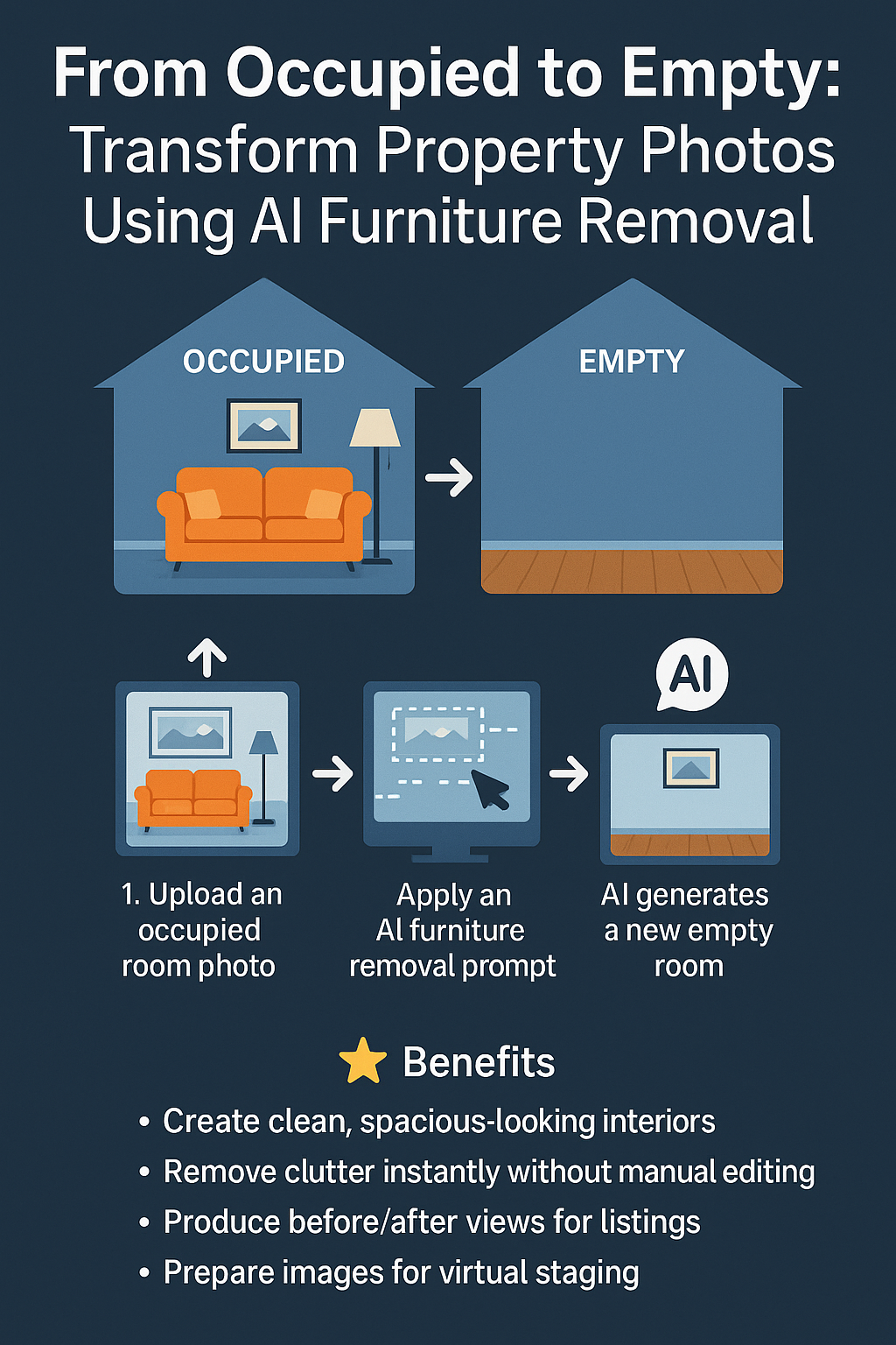 Virtual staging works best on empty rooms, and AI decluttering gives you the perfect clean base.