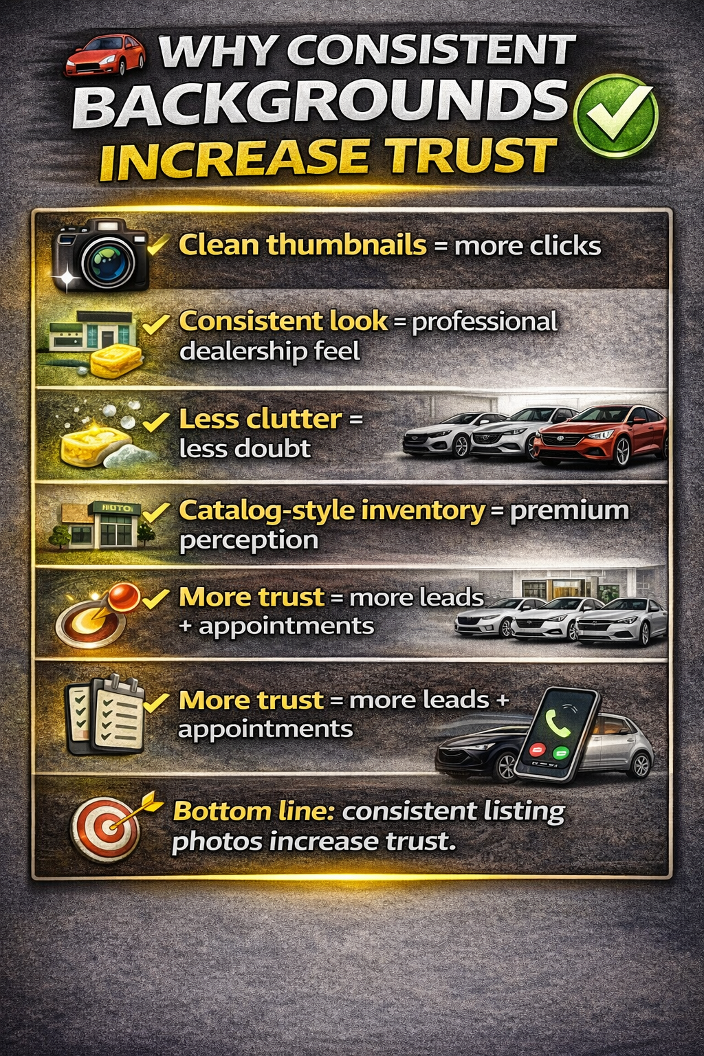 In this evergreen guide, we’ll break down exactly how consistent backgrounds increase trust in car listings, why it impacts conversion, how to implement it, and what mistakes to avoid.