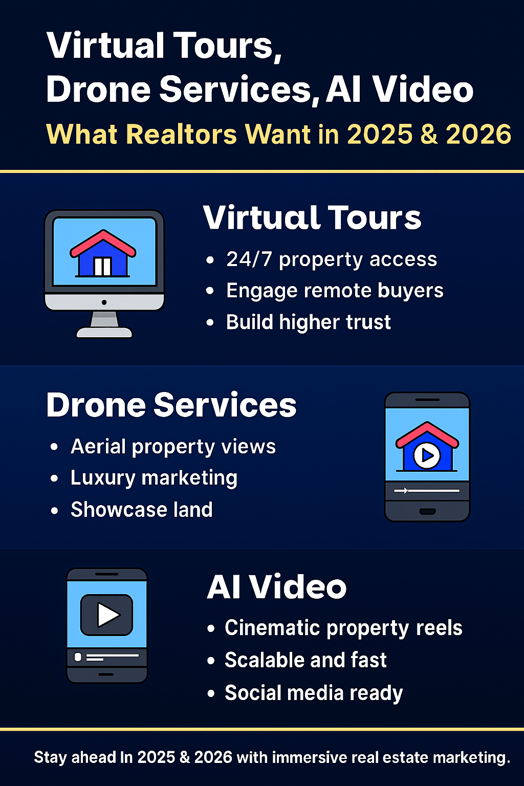The real estate industry is evolving fast, and 2025 & 2026 are all about immersive, AI-powered marketing. Realtors and sellers want results — and you can deliver them with: