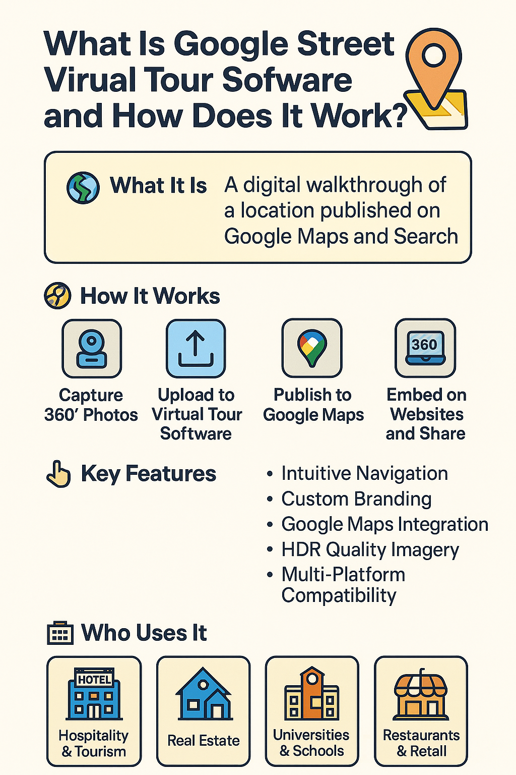Google Street View Virtual Tour Software allows users to create interactive, 360° panoramic tours that appear directly on Google Maps, Google Search, and your Google Business Profile.