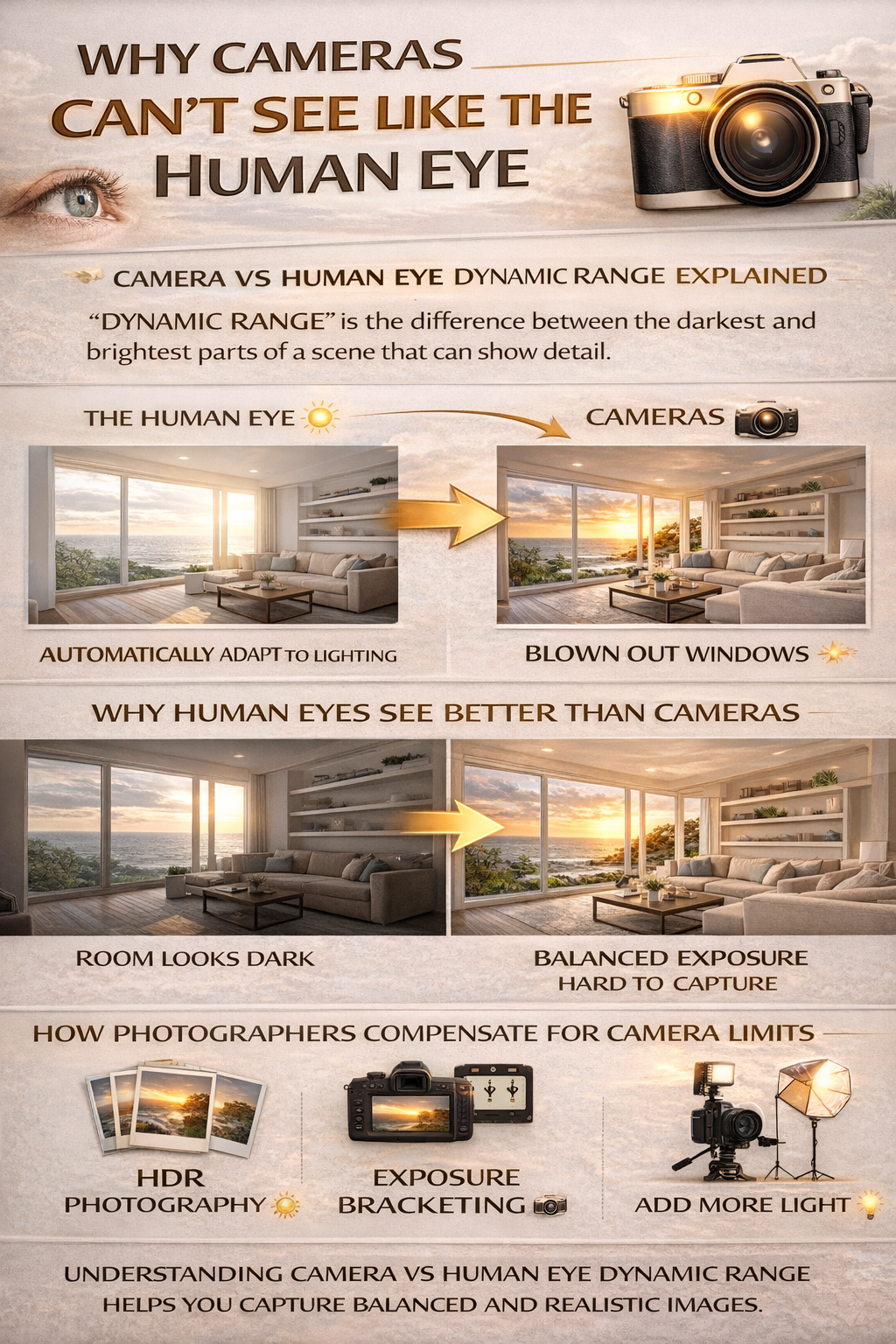 Understanding camera vs human eye dynamic range explains why HDR and flash techniques are so common in property photography.